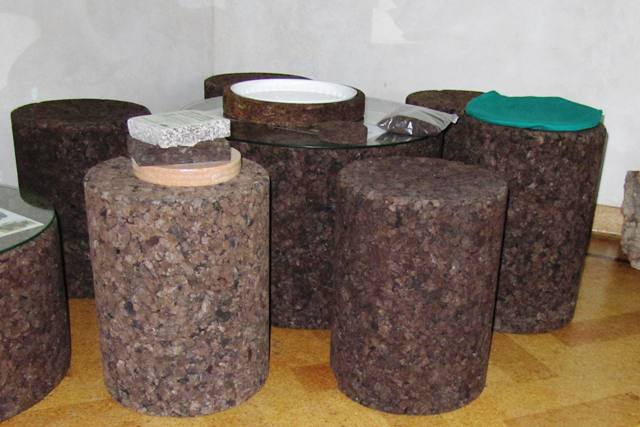 These blocks can then be cut into different dimensions according to the end usage – generally they are cut into boards of 1000x500mm with thicknesses of between 10mm and 150mm. These cork boards can then be applied directly to be used for insulation of buildings (for more information about the acoustic and thermal insulation properties of expanded cork click here), or they can be cut and shaped using CNC machines or normal saws and then sanded down to make decorative items, such as the stools, chairs and tables shown below. When expanded cork is used to make decorative items, sometimes it is necessary to produce the cork at higher densities to make the products more durable. Any excess granules of black cork that are generated by cutting and shaping can then be sold to be mixed with concrete to produce an ultra-lightweight concrete filler.